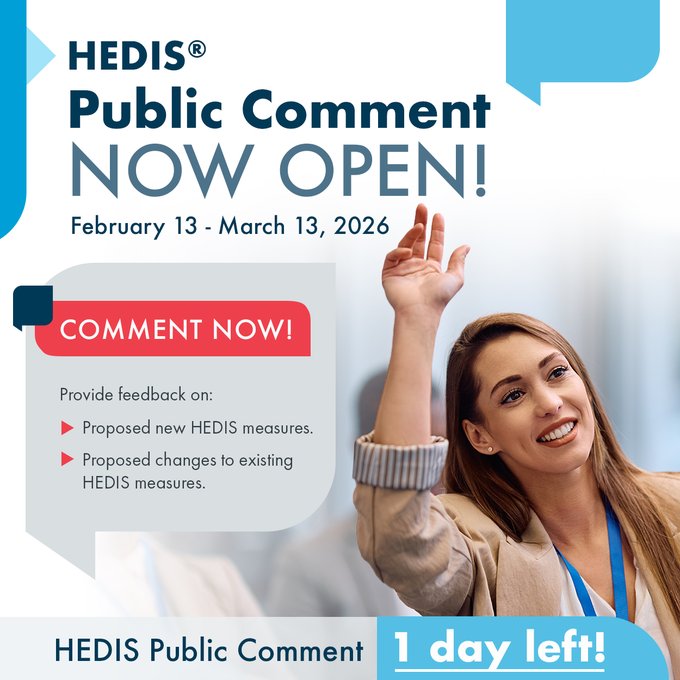 @NCQA ⏰ You still have one day left! #NCQA's HEDIS® Public Comment gives stakeholders a chance to weigh in on proposed updates to the nation’s most widely used quality measures. Submit your comments by 5:00 pm (ET), Friday, March 13, 2026 hbit.ly/2VmgpSHjkxprH
